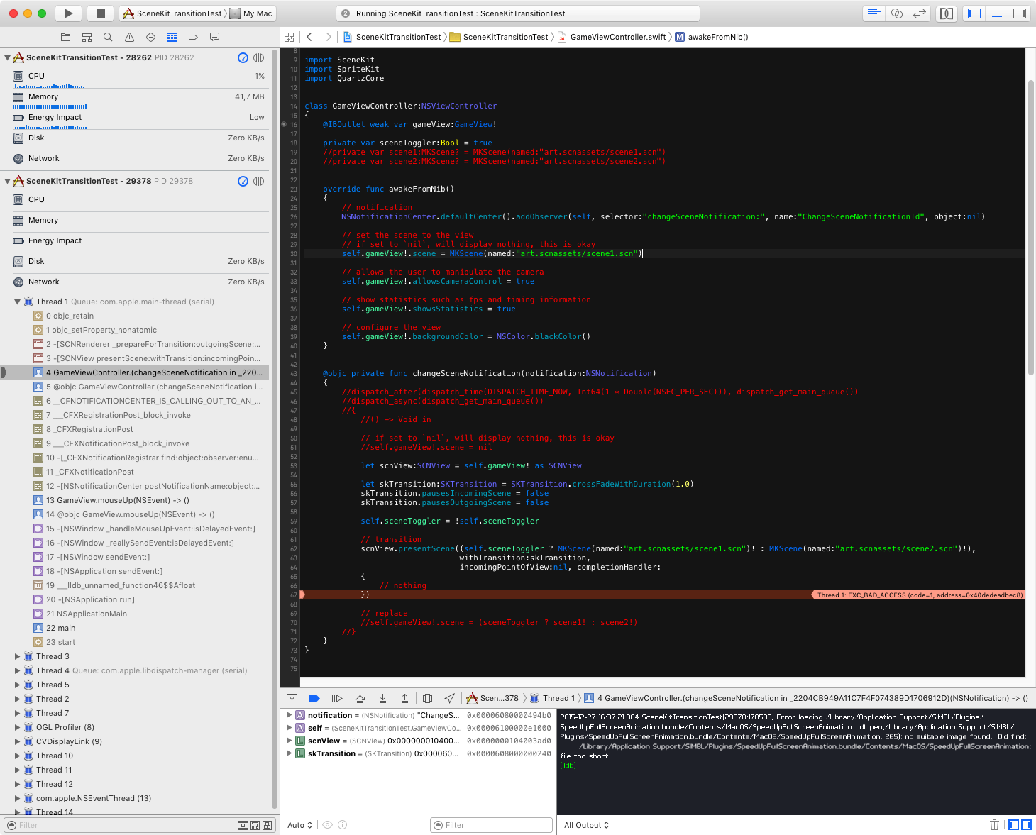 我用一个比较简单的项目重现了你的崩溃。它不使用MKScene,也不使用通知来触发转换。它在第二次尝试加载时崩溃。