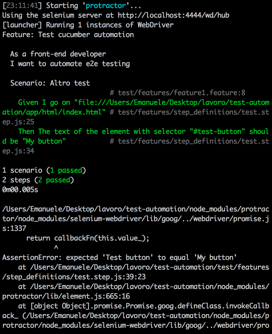 </html>现在,当我运行测试时,我得到了一个奇怪的结果,因为给定场景的两个步骤都通过了,但是由于expect(text).to.equal(myText);行,在第二个步骤中出现了一个错误。这是因为,根据gherkin特性,按钮内的文本应该是My按钮,而不是Test按钮。