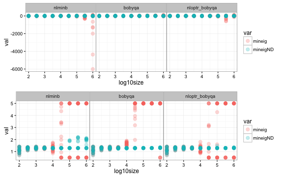 然而,我猜想这是由于对Hessian的错误估计,这导致了对特征值的误导性估计。这是lme4的一个肮脏的秘密--自从我们在几个版本前引入了收敛测试之后,我们就一直在努力使它们正确(这是很难的)。特别是,我们使用了Hessian的朴素有限差分近似,它对大型(>10,000次)数据集的工作效果很差.下面是一个模拟研究的例子(全这里的结果)-蓝色点是通过Richardson外推(numDeriv::hessian)估计的Hessian的最小特征值,粉色点是使用我们的朴素有限差分规则估计的最小特征值。面板有不同的优化器;顶部行不受约束,底部行夹紧到范围(0.5,5) .