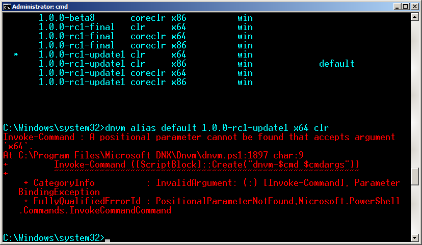 当我在命令提示符下运行dnvm列表时,我看到默认的活动版本是Rc1-update1clr x86。