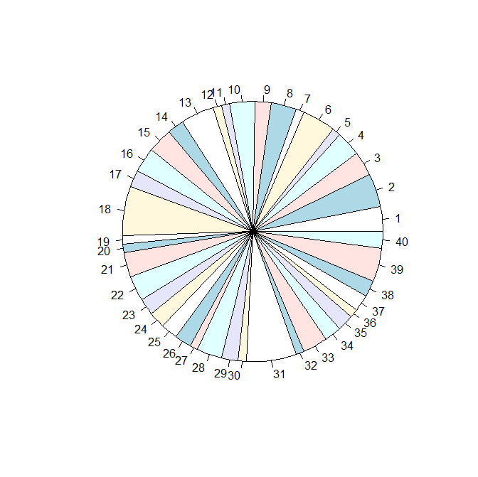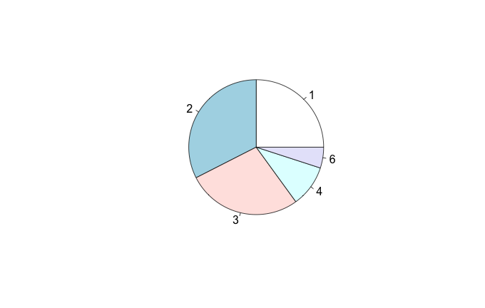 它将数据作为1-40,然后为数据样本创建饼宽,而不是有5个段(1,2,3,4,6),宽度由结果出现的次数(即矢量中唯一元素的频率计数)创建。我怎样才能做到这一点?