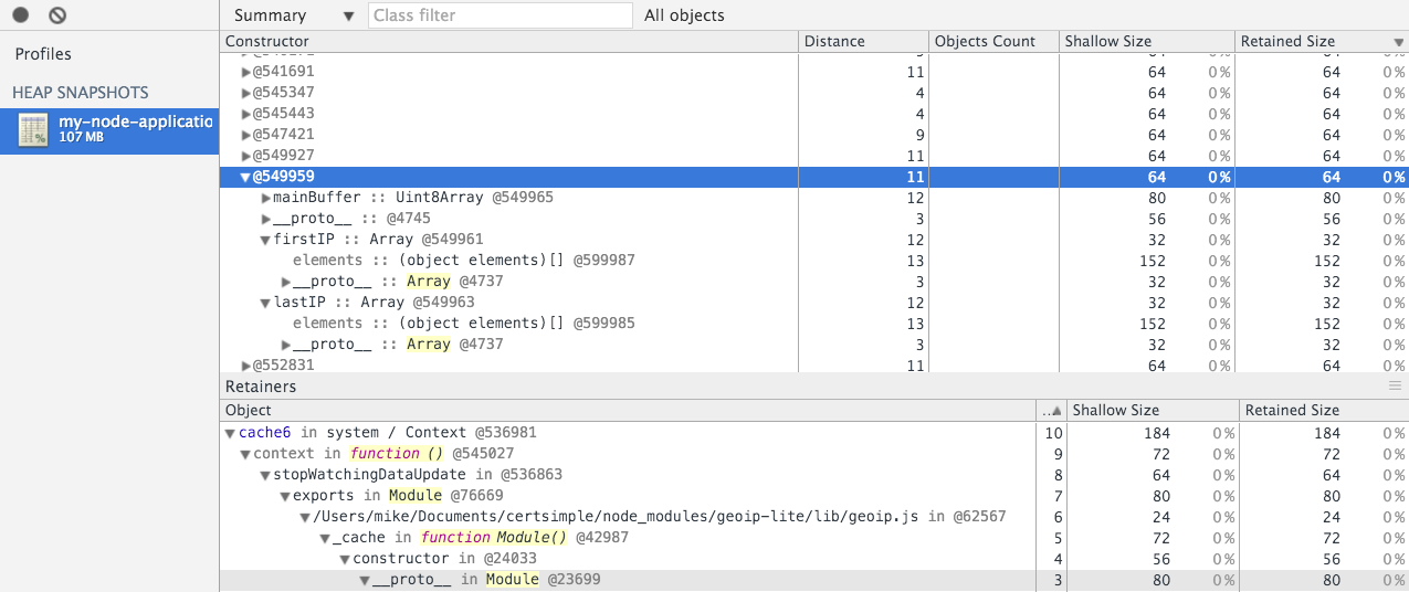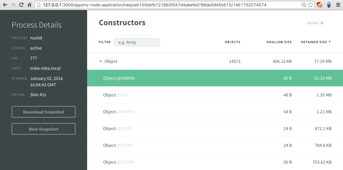 为了深入检查这个对象,我建议使用Chrome工具,可以将由N个Solid控制台拍摄的快照下载到您的本地驱动器中,然后在那里加载。