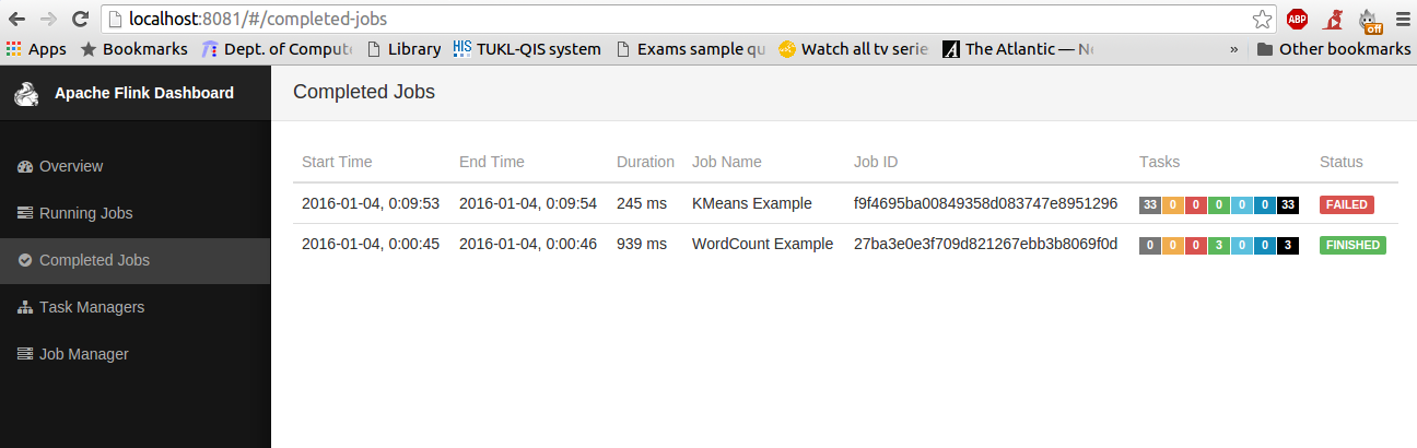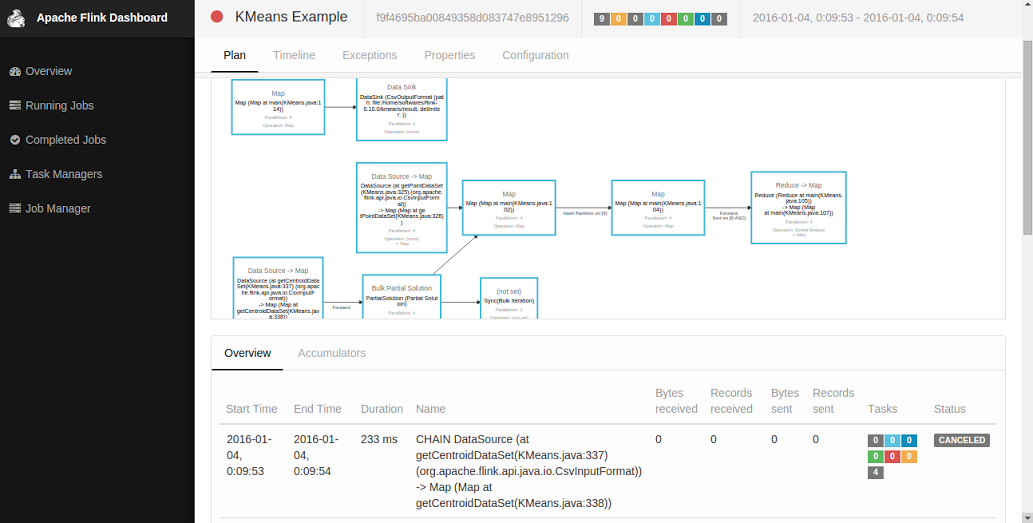 如果您查看flink JobManager的上述屏幕截图,您可以看到KMeans示例的状态为失败。而且可能是由于这种失败状态,在kmeans文件夹中没有结果文件。