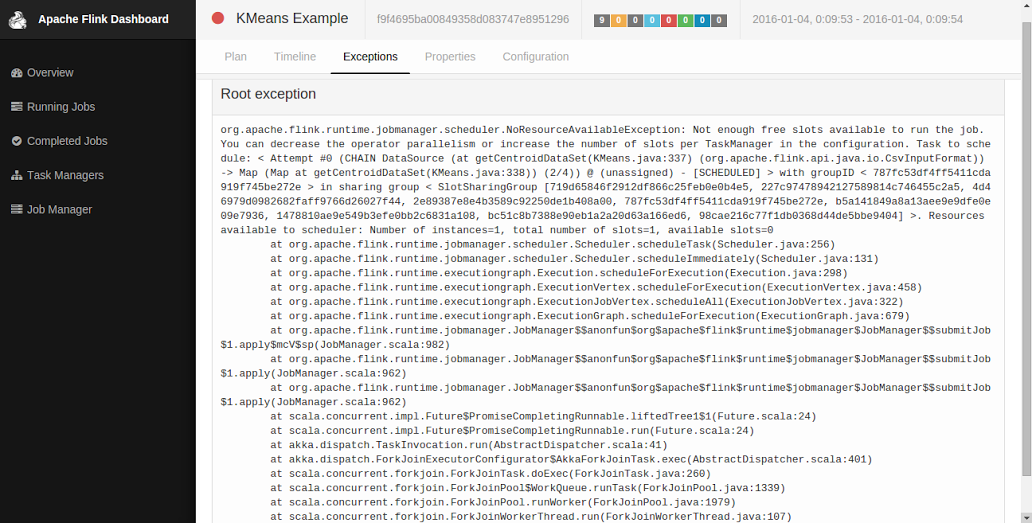 问题是集群是用一个只有一个插槽的TaskManager启动的,并且您希望同时执行KMeans作业,并行性为4。