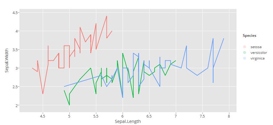 g = g + geom_line(aes(x = Sepal.Length, y = Sepal.Width, color = Species), size = 0.05)