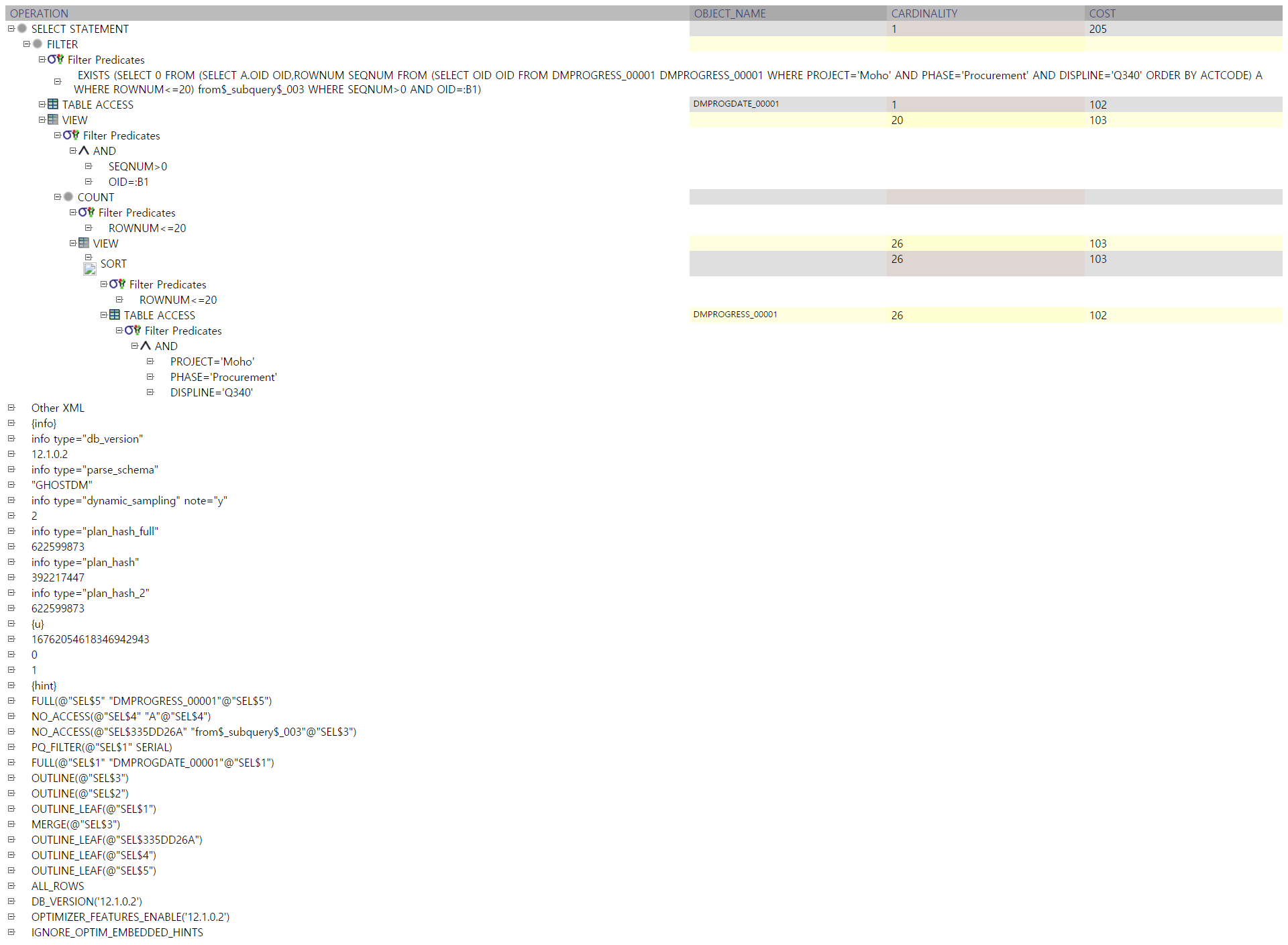 |* 5 | TABLE ACCESS FULL| DMPROGRESS_00001 | 26 | 2288 | 102 (0)| 00:00:01 |