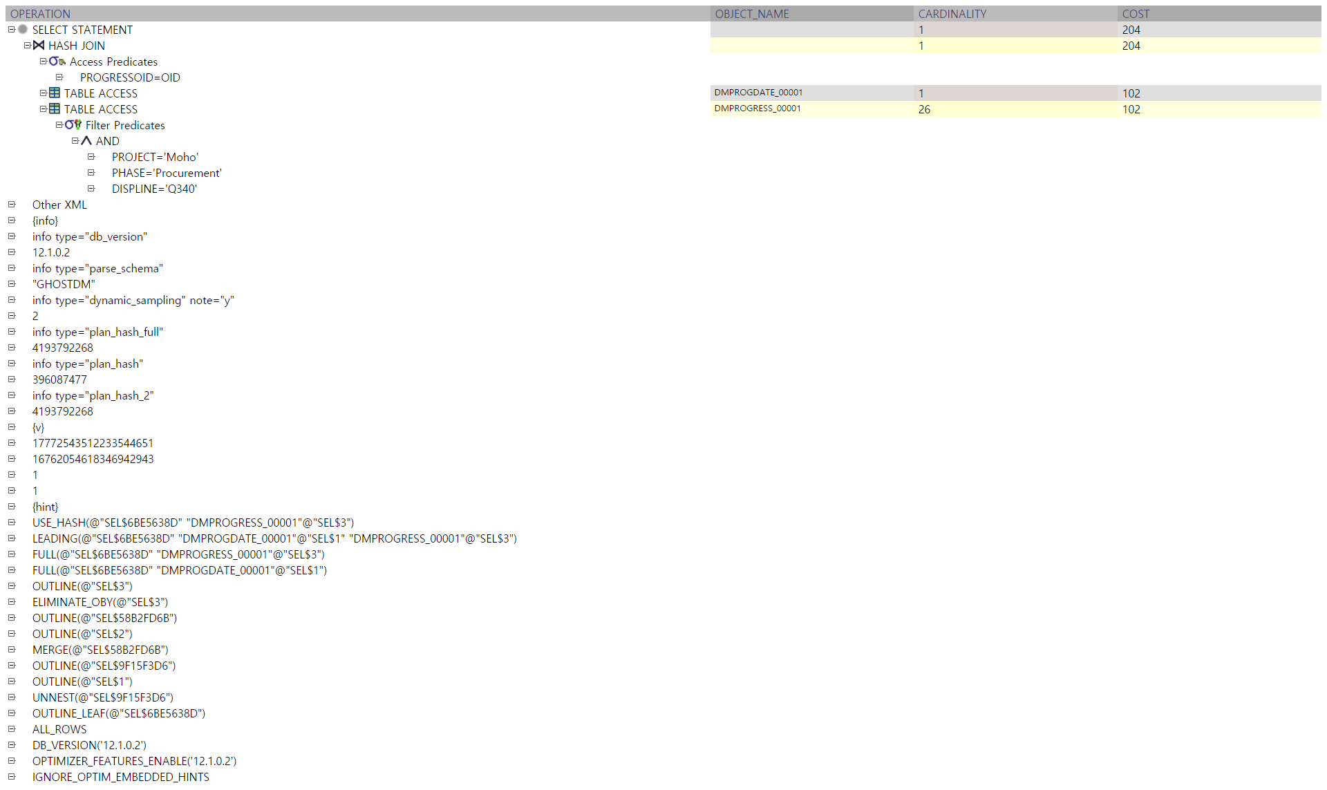 | 2 | TABLE ACCESS FULL | DMPROGDATE_00001 | 1 | 153 | 102 (0)| 00:00:01 |