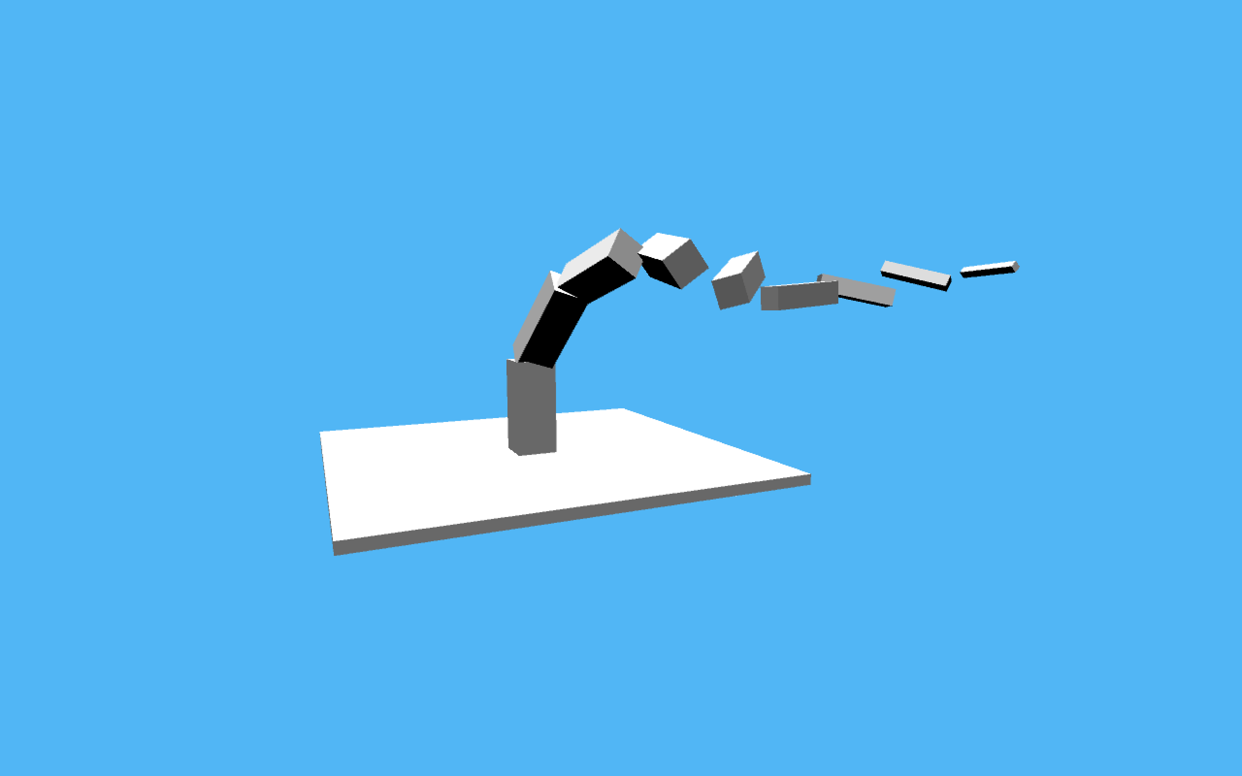 我正在处理创建3D对象的过程,我创建了一个递归方法,我希望能够生成一个更多自由度的类似手指的对象。其思想是,每个段,显示为一个框,产生一个新的段,使它的底面是在同一位置上的前一段的底部(如下图所示)。