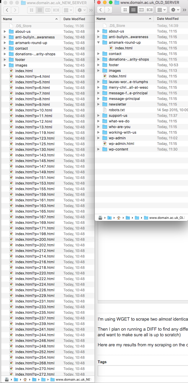 然后,我计划运行一个DIFF来找出任何不同之处。(我将一个站点移到一个新的服务器上,希望确保所有的内容都符合标准)