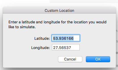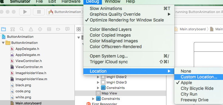 要模拟自定义位置,请选择模拟器,然后从菜单中选择调试选项,然后选择location,然后选择自定义位置。