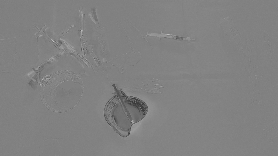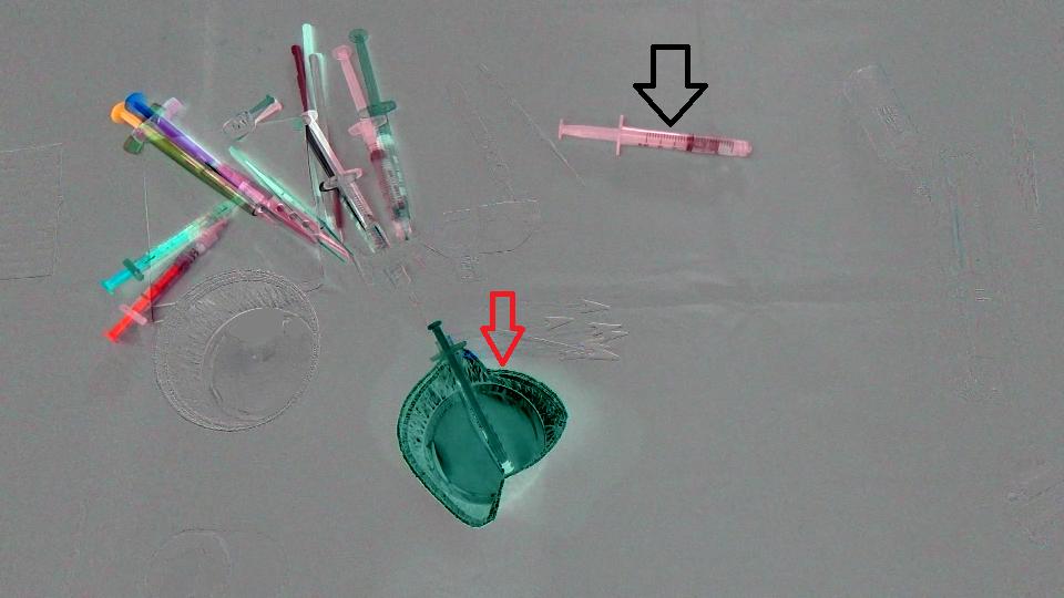目标是检测杯子(红色箭头)已经从场景中消失,注射器(黑色箭头)已经进入场景,换句话说,我们应该只检测与场景中留下/进入的物体对应的区域。而且,很明显,场景左上角的物体与最初的位置有一点不同。我想到了Optical flow,所以我使用OpenCV C++来计算Farneback的一个,以查看它是否足以满足我们的情况,下面是我们得到的结果,然后是我们编写的代码:
