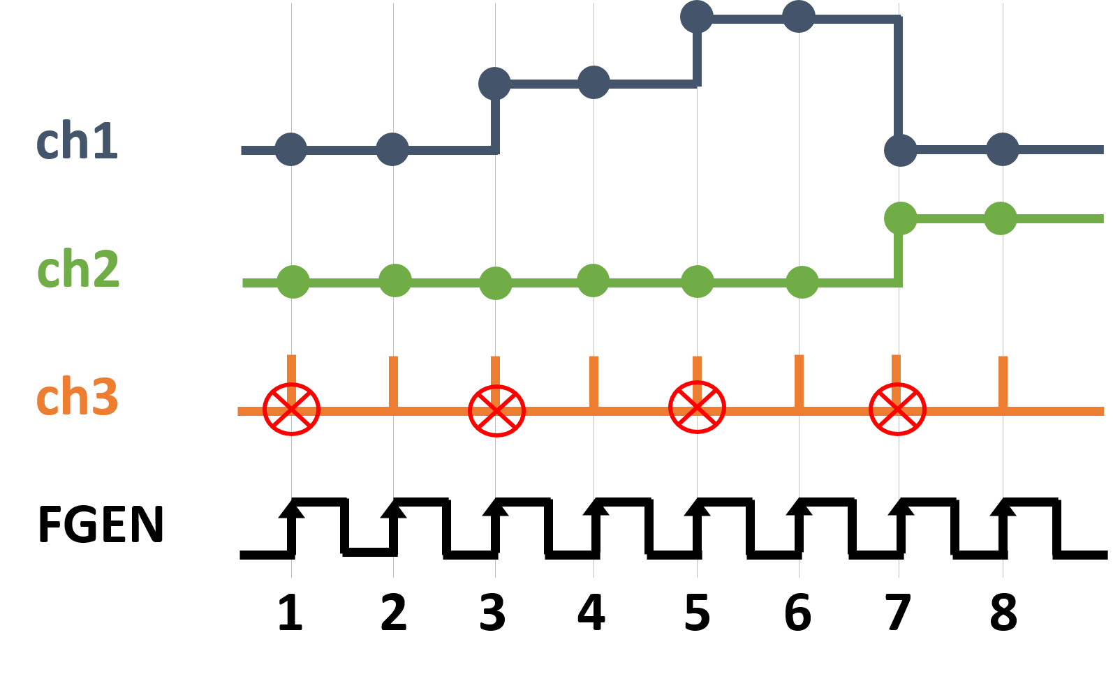 1)我不能使用边缘计数器通道来计数触发器,因为我只有两个PFI通道,我需要这两个通道,一个用于触发ch1,另一个用于ch3 (我不能只使用一个)。