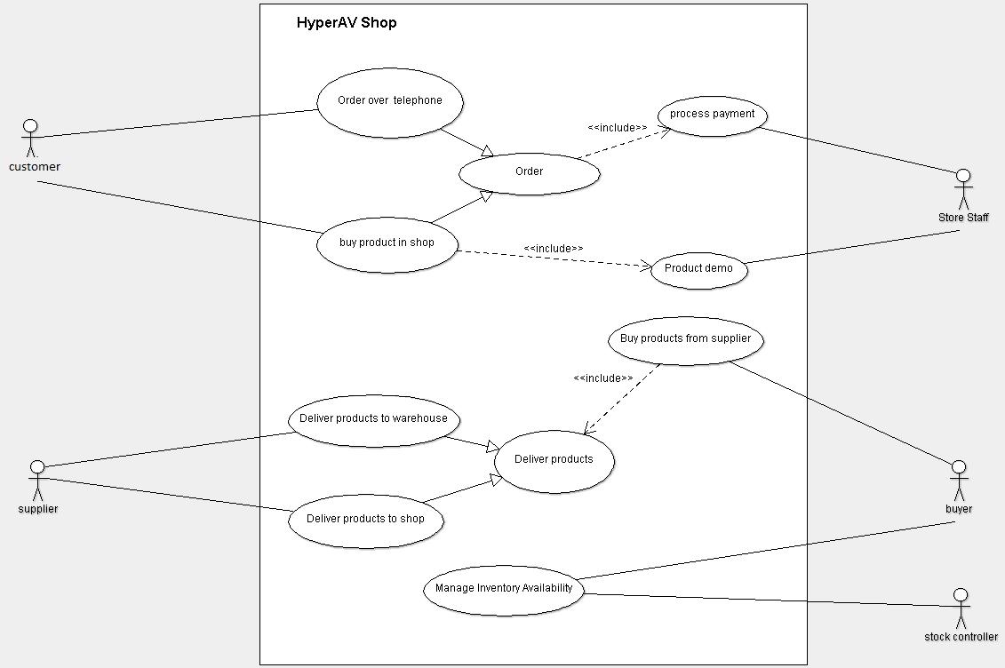 Deliver product:这是两个绝对独立的UCs。他们使用送货服务。但这是另一个SUC (即递送服务)的UC。<<include>>/<<extend>>,因为它们指示使用功能分析。UCs是关于合成的,与之正好相反。Order不是UC。Process payment是一项管理任务,而不是UC。那么这背后有什么用呢?https://stackoverflow.com/questions/34844250