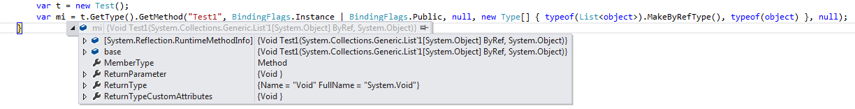 var mi = t.GetType().GetMethod("Test1", BindingFlags.Instance | BindingFlags.Public, null, new Type[] { typeof(List<object>).MakeByRefType(), typeof(object) }, null);