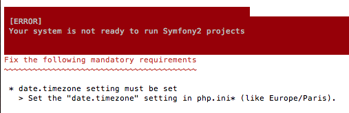 我试图在我的date.timezone文件中设置php.ini文件(位于/etc文件夹中)。我已经这样做了,当我打开它时,它清楚地显示了date.timezone = "Europe/Paris",但是当我检查symfony系统需求时,它会给我一个错误(见屏幕快照),它说它没有设置,而当我检查我的php信息时,它说date.timezone没有值。