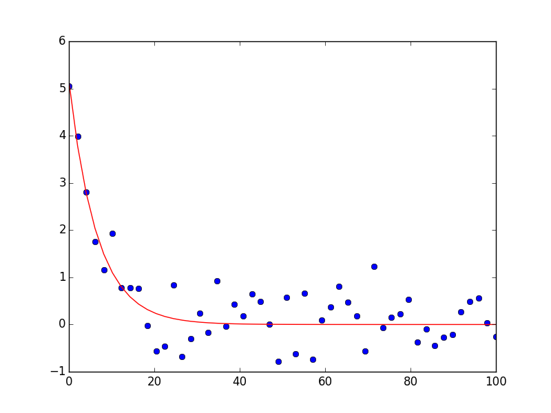 plt.show()首先,我使用您的衰减函数创建一些数据,并给它添加一些噪声;这一部分应该被您的数据替换。剩下的部分很简单,您可以得到以下输出(由于数据中添加了噪声,确切的值可能有所不同):