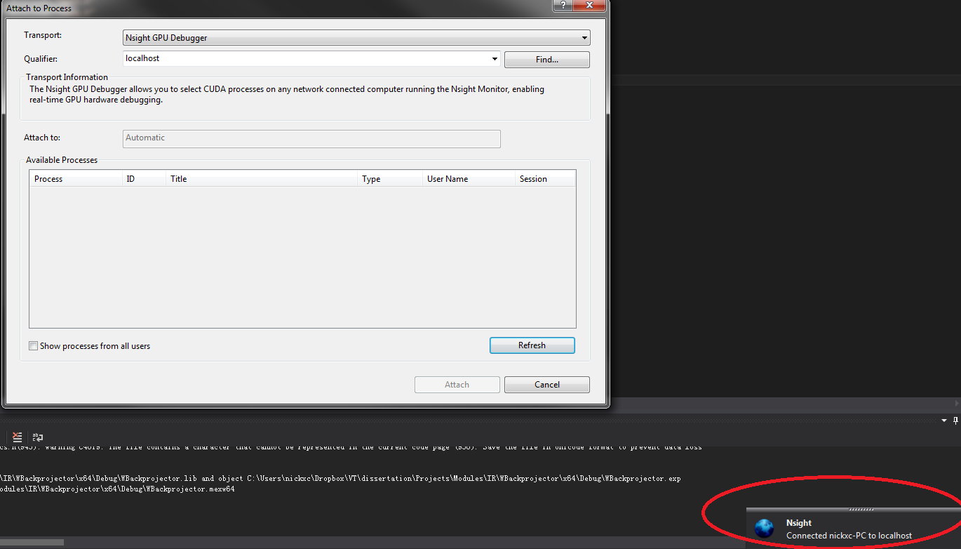 我遇到了一个奇怪的问题,当尝试使用NSight附加am应用程序时,列表中没有显示可用的进程。