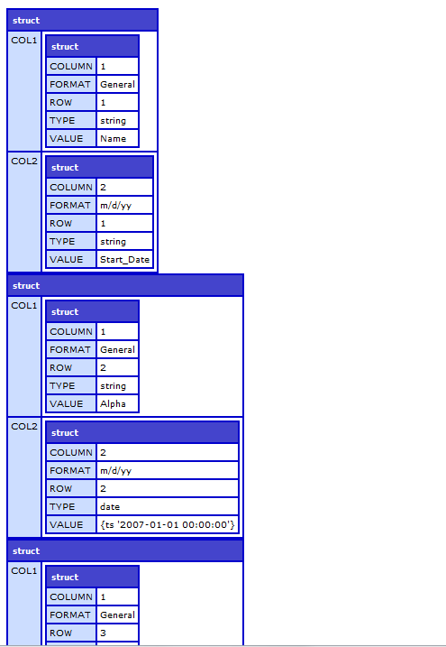 如果您希望在代码方面具有更大的灵活性,也可以使用电子表格功能而不是cfspreadsheet。虽然在这种具体情况下,我认为它们也缺乏必要的特点。因此,您可能会考虑使用底层POI库和一些java代码。这个帖子演示了如何获取有关电子表格单元格和值的各种详细信息。可以很容易地修改它以构建您自己的查询或包含值、格式等的结构数组: