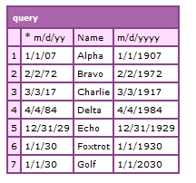 包含根据美国语言环境约定格式化的日期/时间值的字符串。可以表示在100 AD -9999 AD范围内的日期/时间。0-29年被解释为2000-2029年;30-99年被解释为1930-1999年.