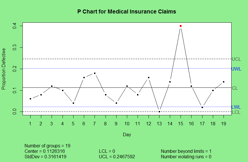 plot(control, restore.par = FALSE, title = "P Chart for Medical Insurance Claims",