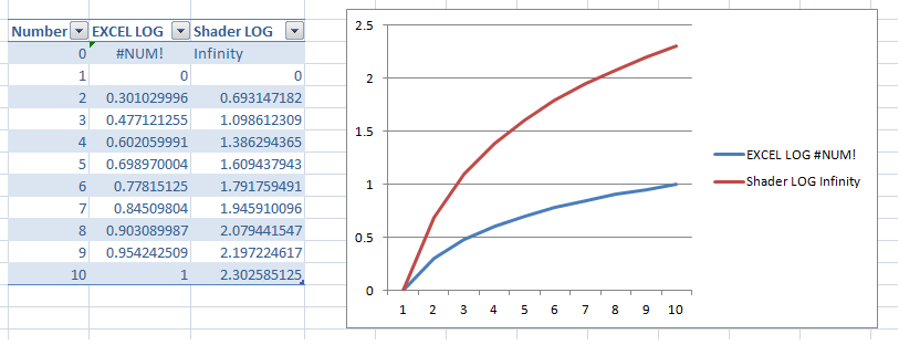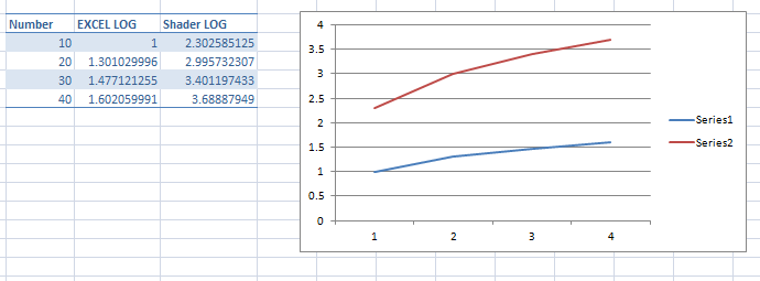 我相信你是被原木的底座绊倒了。在Excel中,基是10,而在glsl中是e。