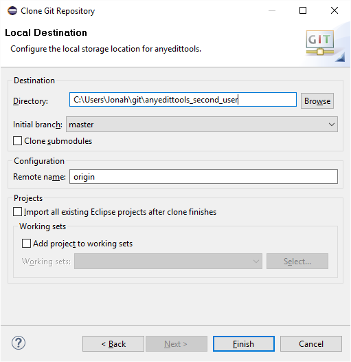 对于本节选项,您可能希望复制同一存储库两次。要做到这一点,您需要在克隆向导的最后一页上提供一个新的目录名: