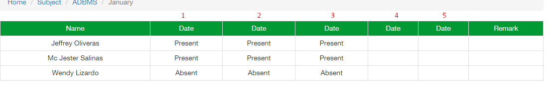 </table>是否有办法将(日期)改为数字(1、2、3、4、5),并仅显示有记录的数字(注释=存在或缺席)。例如,1 2 3有记录,但4 5没有任何记录,所以1 2 3只能显示在表中。