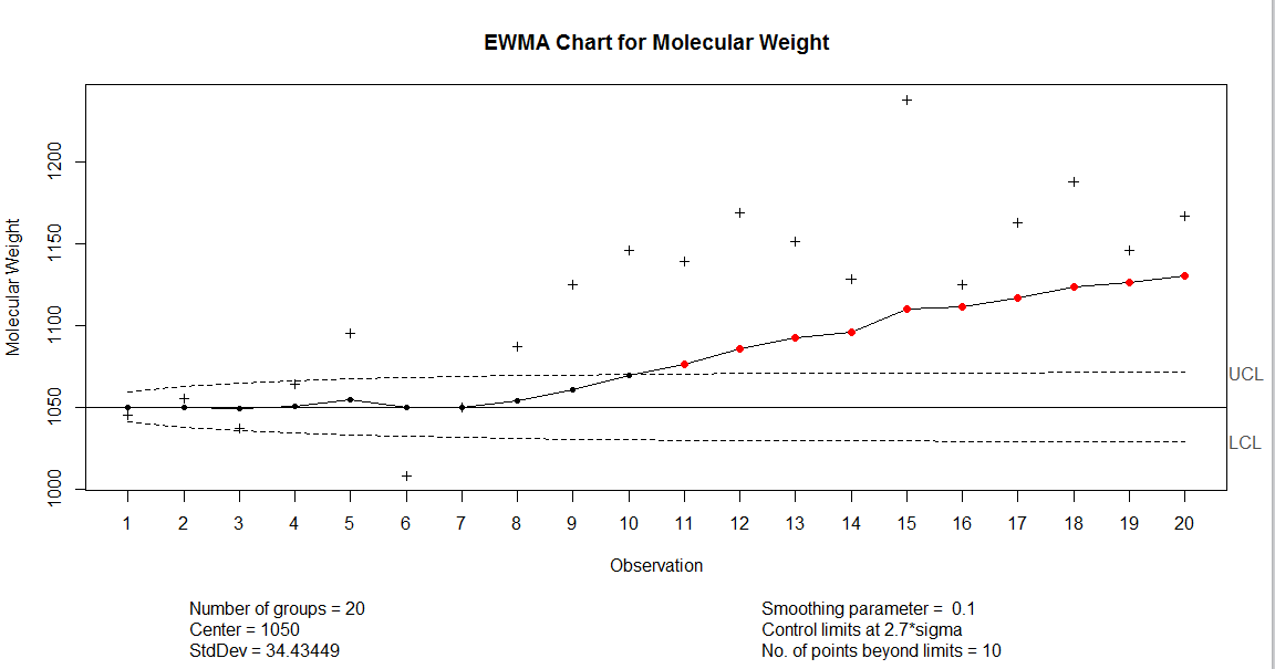 q5<-ewma(q5data, center=1050,nsigmas=2.7,lambda=0.1,ylab="Molecular Weight",xlab="Observation",title="EWMA Chart for Molecular Weight")发布于 2016-01-23 23:08:28