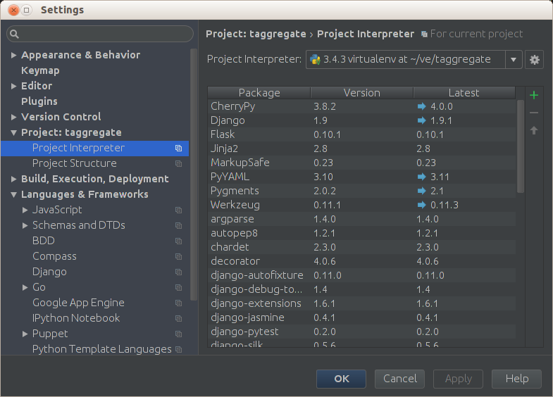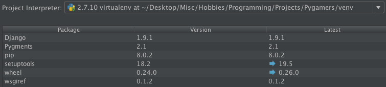 转到Project Interpreter选项(左边)。在屏幕的右边,有一个小装置,如果你按下这个,你会看到这个小菜单弹出: