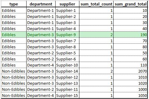 , ('Non-Edibles', 'Department-4', 'Supplier-15', 'ORDER-17', 1050)