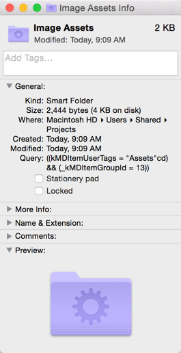 在本例中,相关的Spotlight查询语法是:"(kMDItemUserTags == 'Assets'cd)".(忽略_kMDItemGroupId子表达式,因为以下划线开头的属性名不是公共API。)