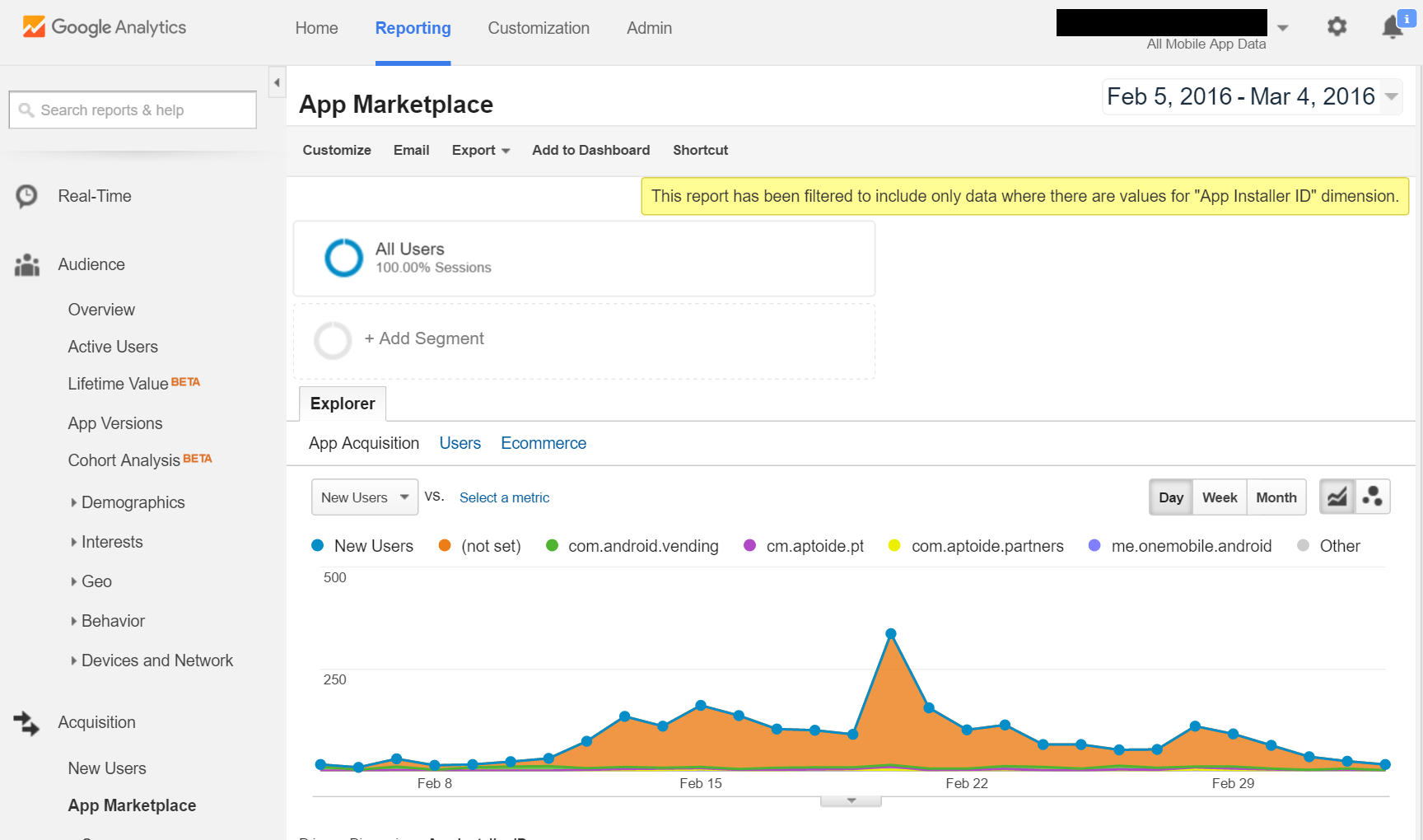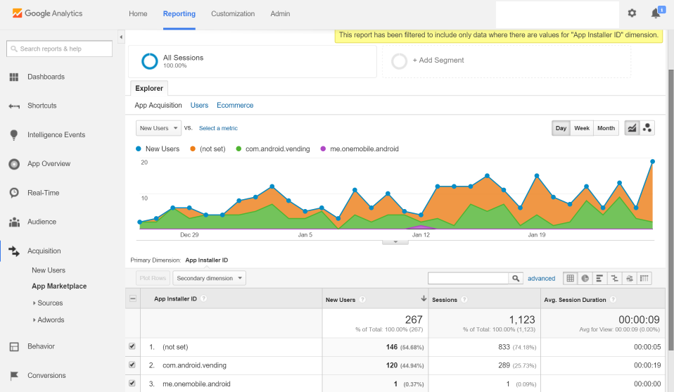 我仍在努力让我的免费游戏应用程序被发现,并注意到我的新下载大部分来自‘(而不是设置),根据谷歌分析/Aquisition/Analytics。尽管有一个‘这个报告已经过滤,只包括数据,在页面上有“”维度的值的数据。根据医生的说法:
