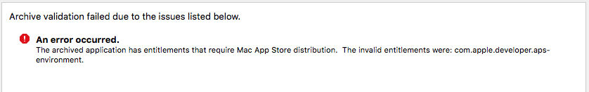 我试图在Mac之外发布我的Mac应用程序的一个版本。我复制了我的目标,用"Developer“对其进行了签名,删除了iCloud功能,创建了一个新的应享权利文件,其中删除了iCloud和APS应享权利,并在新目标中引用了这一点。目标构建和存档都很好,但是当我尝试使用“验证开发人员ID签名的应用程序”验证它时,我会遇到一个错误: