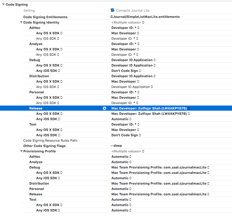 编辑:在Xcode中添加目标的代码签名设置,如果这有帮助的话: