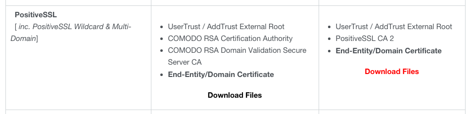 确保滚动列表并下载与表中的PositiveSSL行相关的文件。