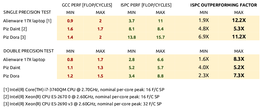 我不知道为什么ISPC还没有被广泛接受。也许是因为他的幼年阶段,但它已经显示出强大的能力(恩布里,OSPray)在CG/科学可视化社区。ISPC是编写HPC内核的一个很好的选择,因为它似乎很好地弥合了性能-生产力差距。