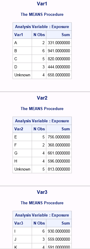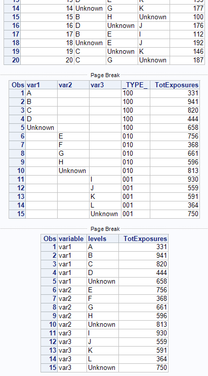 您可以在一个PROC摘要步骤中总结所有三个变量,但是输出与您指定的不完全相同。但是,这可以通过对PROC摘要输出的数据步骤操作来实现。我在CLASS语句中使用MLF选项将所有类变量“转换”为字符。您没有,但它很有用,因为类变量可以是数字的任何一个字符。