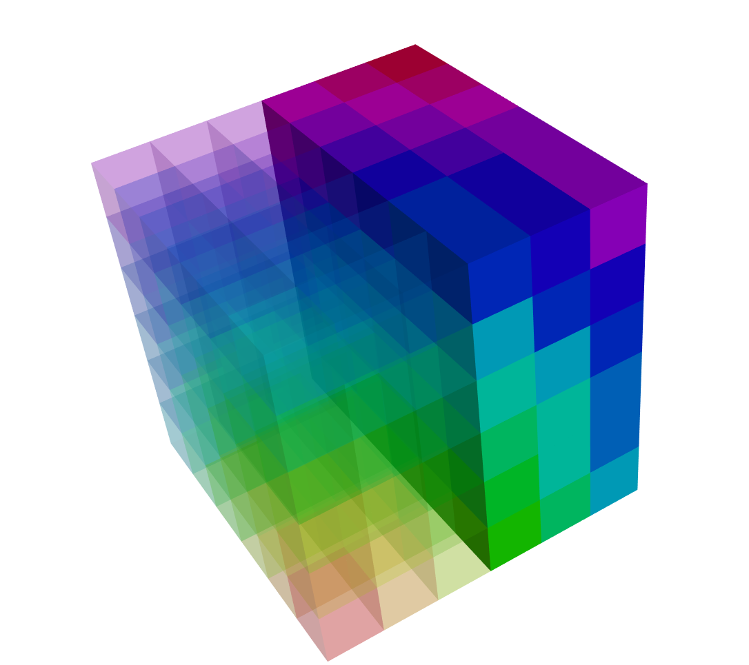此示例用于6x6x6立方体,颜色基于中心到origen的欧几里德距离。希望这将向您展示一种方式,以适应您的颜色,因为你喜欢。