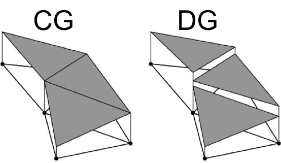 简单地说,在有限元法中,人们试图用预先定义的基函数的线性组合来逼近问题的解。这些基函数可以选择为连续的或不连续的。得到的数值方法称为CG/DG (连续/不连续Galerkin)方法。在DG方法中,基函数只是分段连续的:除了一个元素外,每个基函数在域中的任何地方都是零。也请看这个优秀的维基百科文章,它有一些非常好的数字。