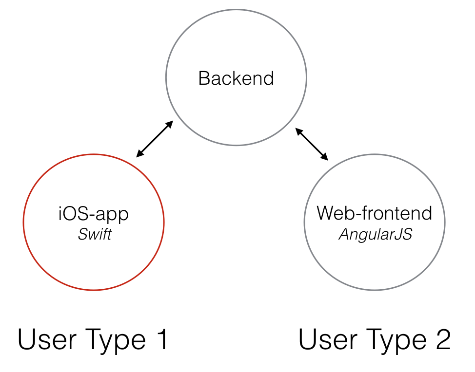 我正在开发一个在线平台,其中一种类型的用户(用户类型2)在web应用程序中创建一个配置文件,并将数据提交到web应用程序中。然后,另一种用户类型(用户类型1)可以从iOS-app中查看这些数据。有关概述,请参见下图。
