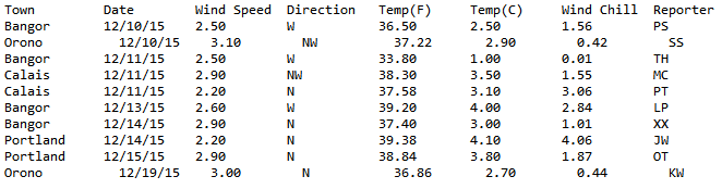 System.out.printf("Town\tDate\tWind Speed\tDirection\tTemp(F)\tTemp(C)\tWind Chill(C)\tReporter\n");