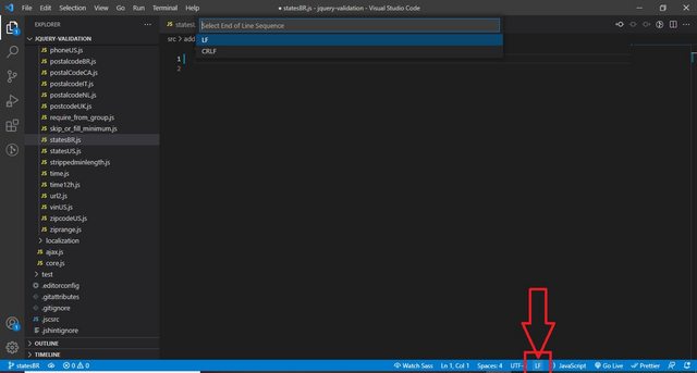 如果您的.jscsrs与规则"validateLineBreaks":"LF"一起使用,这意味着您必须使用LF作为换行符;如果您使用的是其他换行符号(如CRLF),则JSCS将给您一个错误,例如: