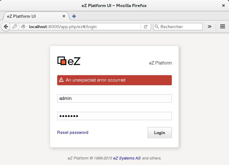 在安装eZPublish 6之后,我遇到了一个问题。当我试图用默认密码(发布)在localhost:8000/app.php/ez上使用用户名admin连接时,发生了以下错误: