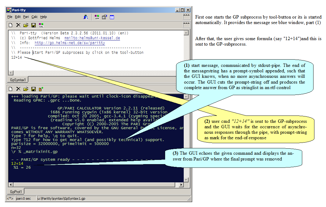 这里有一幅图像,它展示了通信的原理。我们看到了我的GUI的窗口,它有一个Pari/GP子进程,它通过CreateConsoleProcess-过程提供的STDIN/STDOUT管道在后台进行通信。