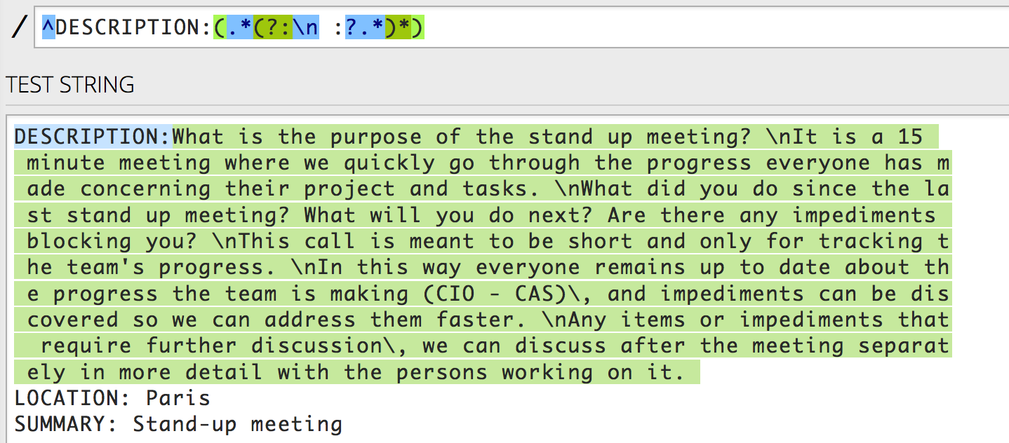 let descriptionRegex = "(?m)DESCRIPTION:(.*(?:\\n :?.*)*)"返回:"What is the purpose of the stand up meeting? \nIt is a 15 "