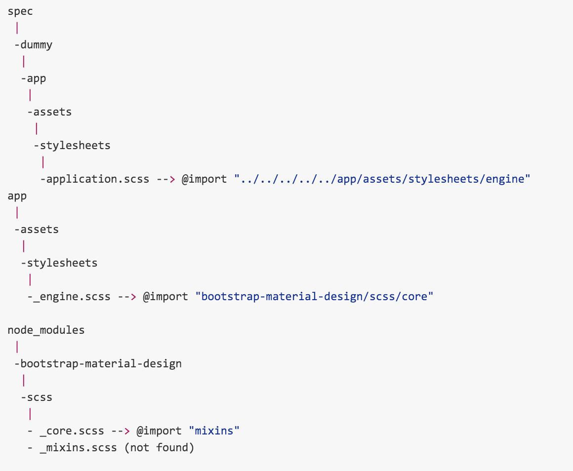 includePaths: ['../../node_modules']cd spec/dummy && gulp sass目标application.scss注意事项:很明显,core在node_modules内的bootstrap-material-design包中找到