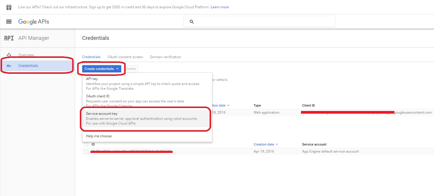 首先,在Google控制台的Create凭据下创建一个服务帐户键。