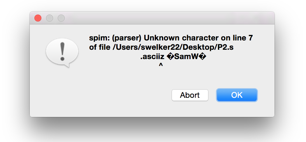 add $s0, $zero, $t0将它导入QtSpim可以很好,只要我没有.asciiz语句中包含的第4行。每次我尝试在其中运行该语句时,我都会收到这样的错误消息。