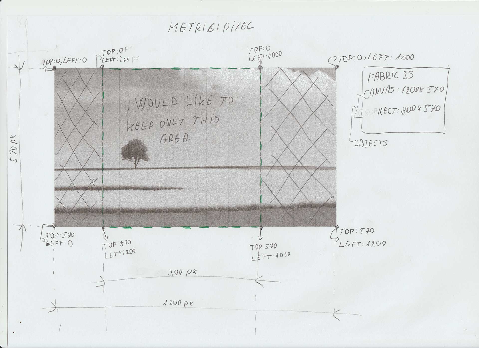 我也附上了一张照片。(您可以看到我想要完成的任务)是否可以以某种方式调整FabricJS画布的大小,以保留由矩形(绿色虚线矩形)选定的区域。我想我有所有必要的坐标,就像你在附件中看到的。