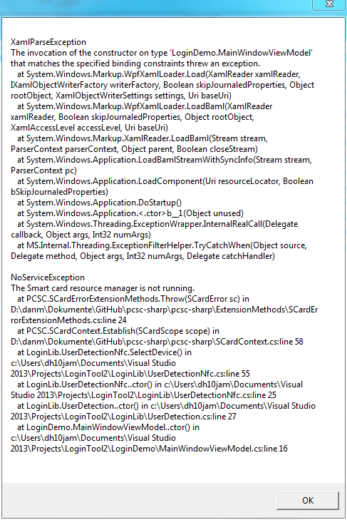 这个问题与WPF本身没有任何共同之处。如果我们分析堆栈跟踪,我们可以看到它是由pcsc-夏普库抛出的。更仔细的分析将显示抛出NoServiceException异常是因为以下本机方法返回了一个错误: